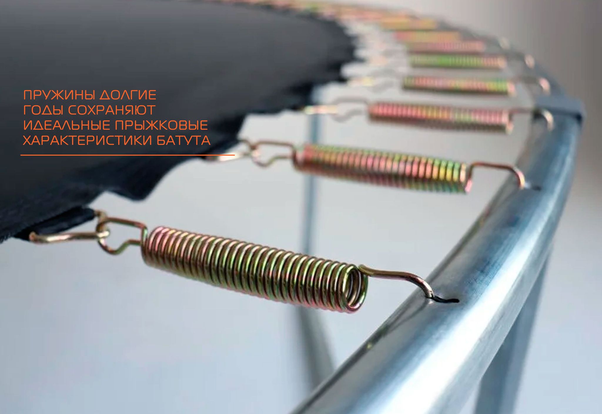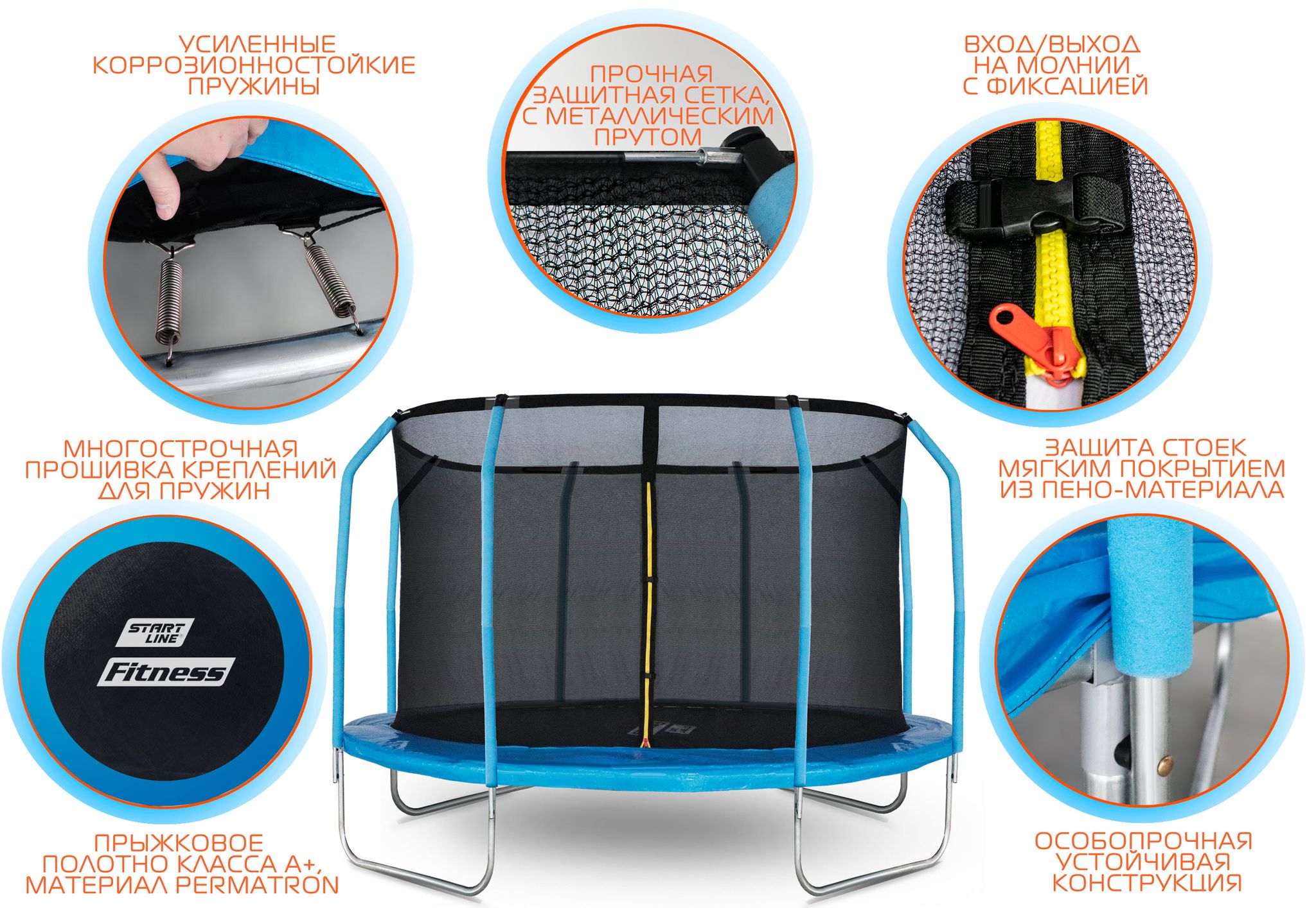 Металлический каркас батутов выполнен из прочной гальванизированной стали, максимально допустимый вес пользователя 110 кг. Прыжковое полотно производится из специального высокопрочного материала Permatron, устойчивого к любым неблагоприятным воздействиям окружающей среды и механическим воздействиям. Permatron – эластичный материал, легко возвращающийся в исходное состояние при постоянном воздействии с разной нагрузкой. Он устойчив к внешним воздействиям: ультрафиолету, плесени, влаге, резким изменениям температуры. Термическая обработка делает эту ткань устойчивой к постоянным изгибам и стрессовым нагрузкам. Прыжковое полотно для батута, изготовленное из перматрона, подходит для применения дома и на улице. Этот материал не боится осадков и воздействия солнечных лучей, также обладает антисептическими свойствами. Защитный мат для пружин, расположенный по периметру батута, состоит из четырех слоев, обшитых ПВХ материалом, плотностью 130 г/см3 и надежно закрывает пружины.