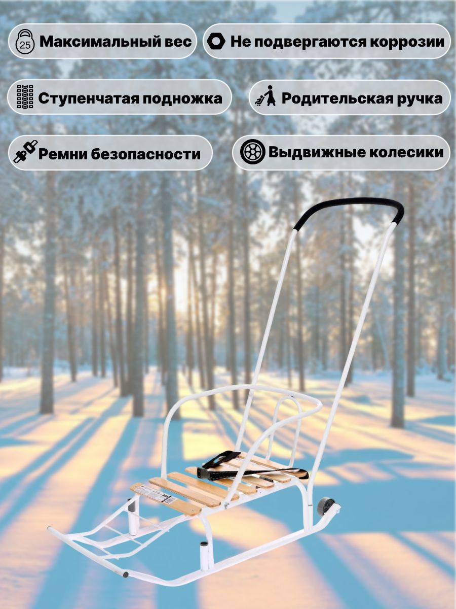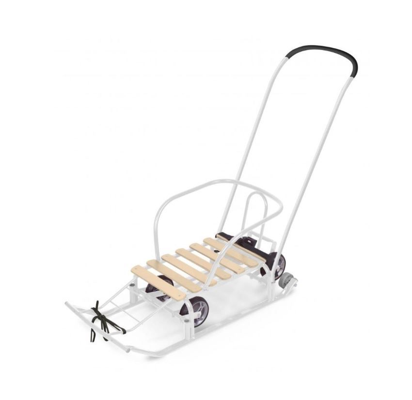 Металлические санки для катания и перевозки детей. Компактные в сложенном виде. <br/><br/>Габаритные размеры: Вес нетто, кг 7,0<br/><br/>Высота до сиденья, мм 180<br/><br/>Размер сиденья (ДхШ), мм 460х290<br/><br/>Размер изделия в сложенном виде (ДхШхВ), мм 920х440х200<br/><br/>Размер изделия в разл. виде (Д без ручки х Ш по спинке х В по спинке), мм 1200х440х940/1010<br/><br/>Преимущества:Металлический каркас с антикоррозийным покрытием<br/><br/>Механизм выдвижных колёсных шасси<br/><br/>Плоские полозья<br/><br/>Удлиненное сиденье - поперечная рейка из окрашенного древесного материала<br/><br/>Складная ручка-толкатель<br/><br/>Складная спинка<br/><br/>Ступенчатая подножка<br/><br/>Ремень безопасности<br/><br/>Колеса на полозьях<br/><br/>Грузоподъемность до 25 кг<br/><br/>В индивидуальной упаковке