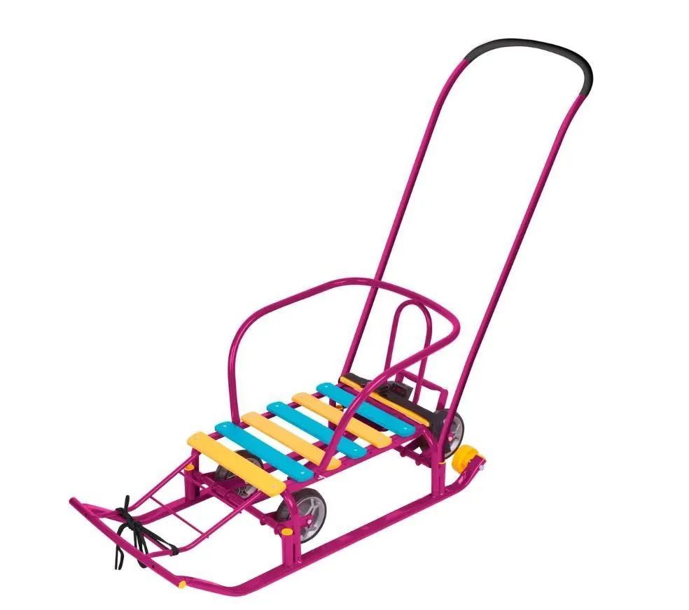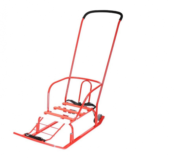 Металлические санки для катания и перевозки детей. Компактные в сложенном виде. <br/><br/>Габаритные размеры: Вес нетто, кг 7,0<br/><br/>Высота до сиденья, мм 180<br/><br/>Размер сиденья (ДхШ), мм 460х290<br/><br/>Размер изделия в сложенном виде (ДхШхВ), мм 920х440х200<br/><br/>Размер изделия в разл. виде (Д без ручки х Ш по спинке х В по спинке), мм 1200х440х940/1010<br/><br/>Преимущества:Металлический каркас с антикоррозийным покрытием<br/><br/>Механизм выдвижных колёсных шасси<br/><br/>Плоские полозья<br/><br/>Удлиненное сиденье - поперечная рейка из окрашенного древесного материала<br/><br/>Складная ручка-толкатель<br/><br/>Складная спинка<br/><br/>Ступенчатая подножка<br/><br/>Ремень безопасности<br/><br/>Колеса на полозьях<br/><br/>Грузоподъемность до 25 кг<br/><br/>В индивидуальной упаковке