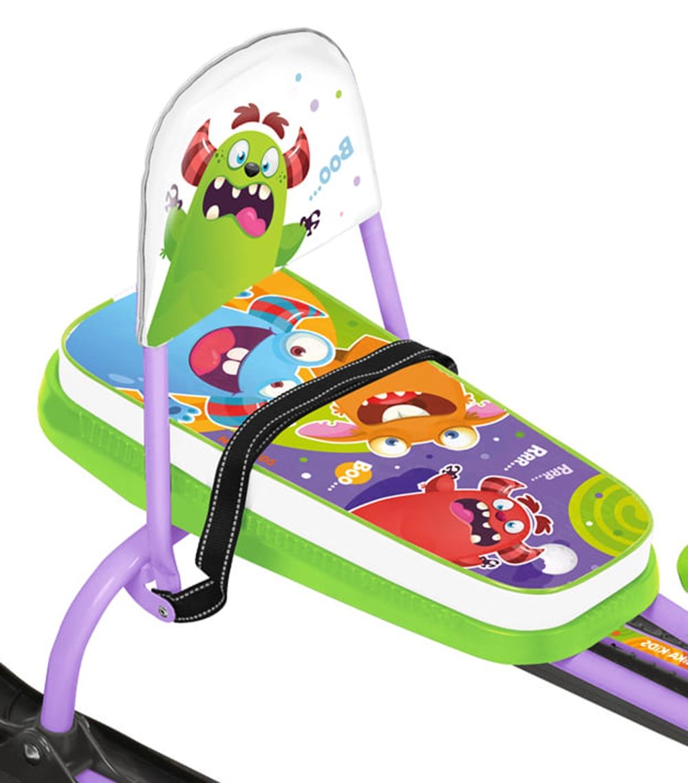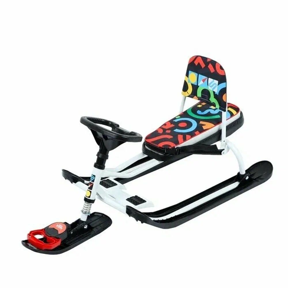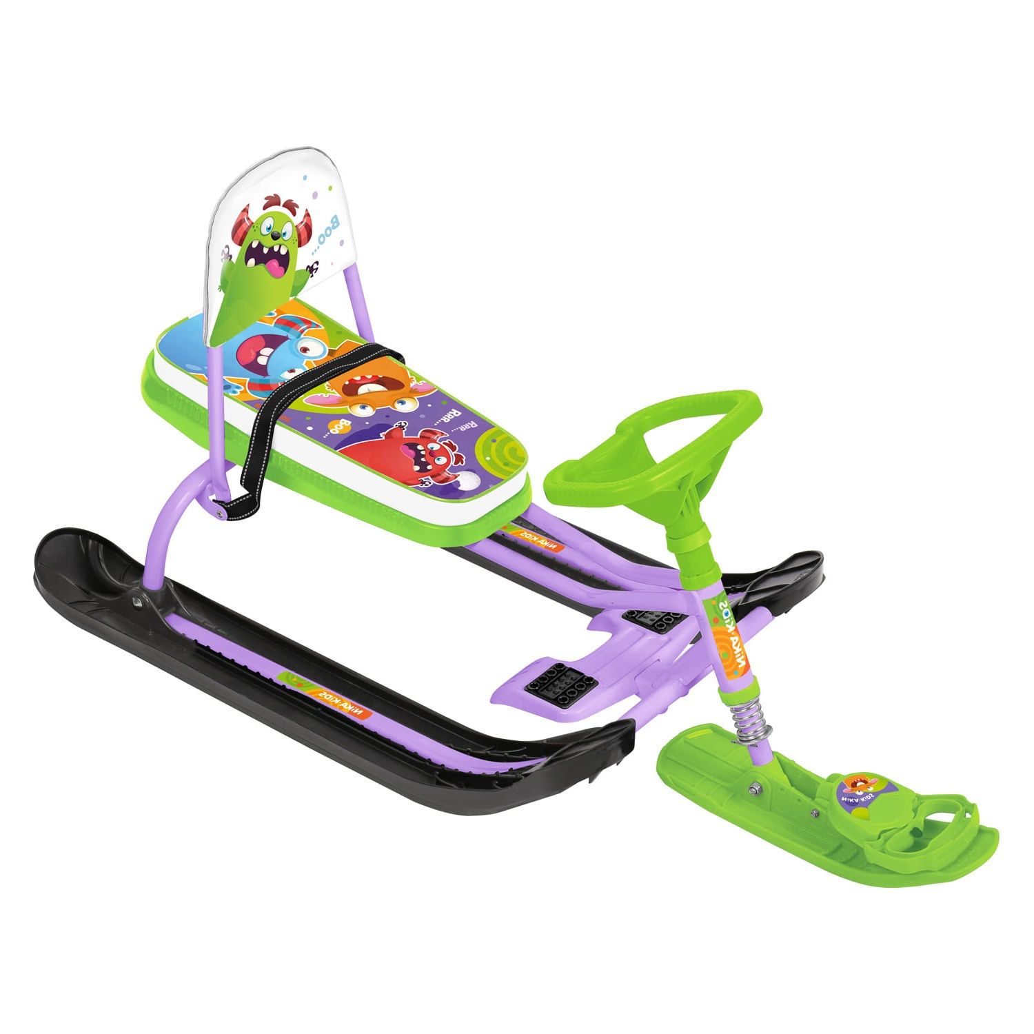 Снегокат Ника Snowdrive - это снегокат для детей от 4 лет и до 12. На таком снегокате может прокатиться и взрослый - выдержит нагрузку до 100 кг. Преимущество такого снегоката в амортизации. Под сидением установлена пружина, которая при спуске с горы смягчит все ухабы и обледенелые бугорки. Снегокат высокий имеет высоту от лыжи до сидения 61.5 см. Сидение обтянуто морозостойким материалом - искусственная кожа с изображениями. На передней лыже буксировочный трос-рулетка. Если отпустить трос он за секунды смотается и не позволит запутаться верёвке вокруг снегоката. Руль высокий, такой как у велосипеда. На передней части установлена платформа в виде лапок с зубчиками и резиновой проклейкой, чтобы нога не соскользнула- это прекрасное торможение по снегу. Снегокат укомплектован фонариком, что позволит задержаться на прогулке когда стемнеет, ведь зимой дни очень короткие, а погулять на свежем воздухе хочется подольше.