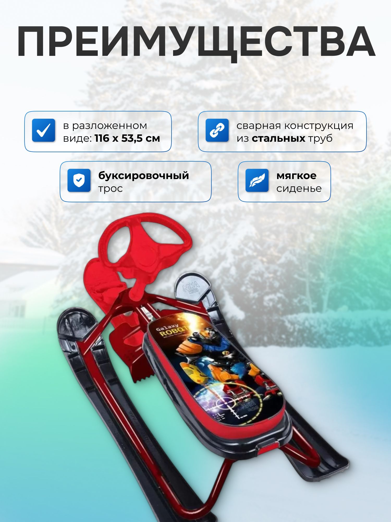 Снегокат для детей Ника "SNOWDRIVE", буксировочный трос, велоруль, фонарик