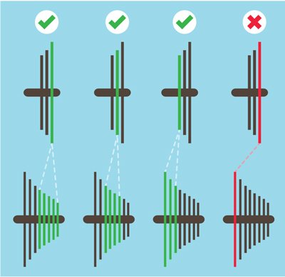 Давайте посмотрим, какие сочетания звезд применимы на примере велосипеда с тремя передними звездами и восемью задними звездами. Главный принцип прост: необходимо, чтобы сочетание передних и задних звезд всегда было примерно в одной вертикальной плоскости.